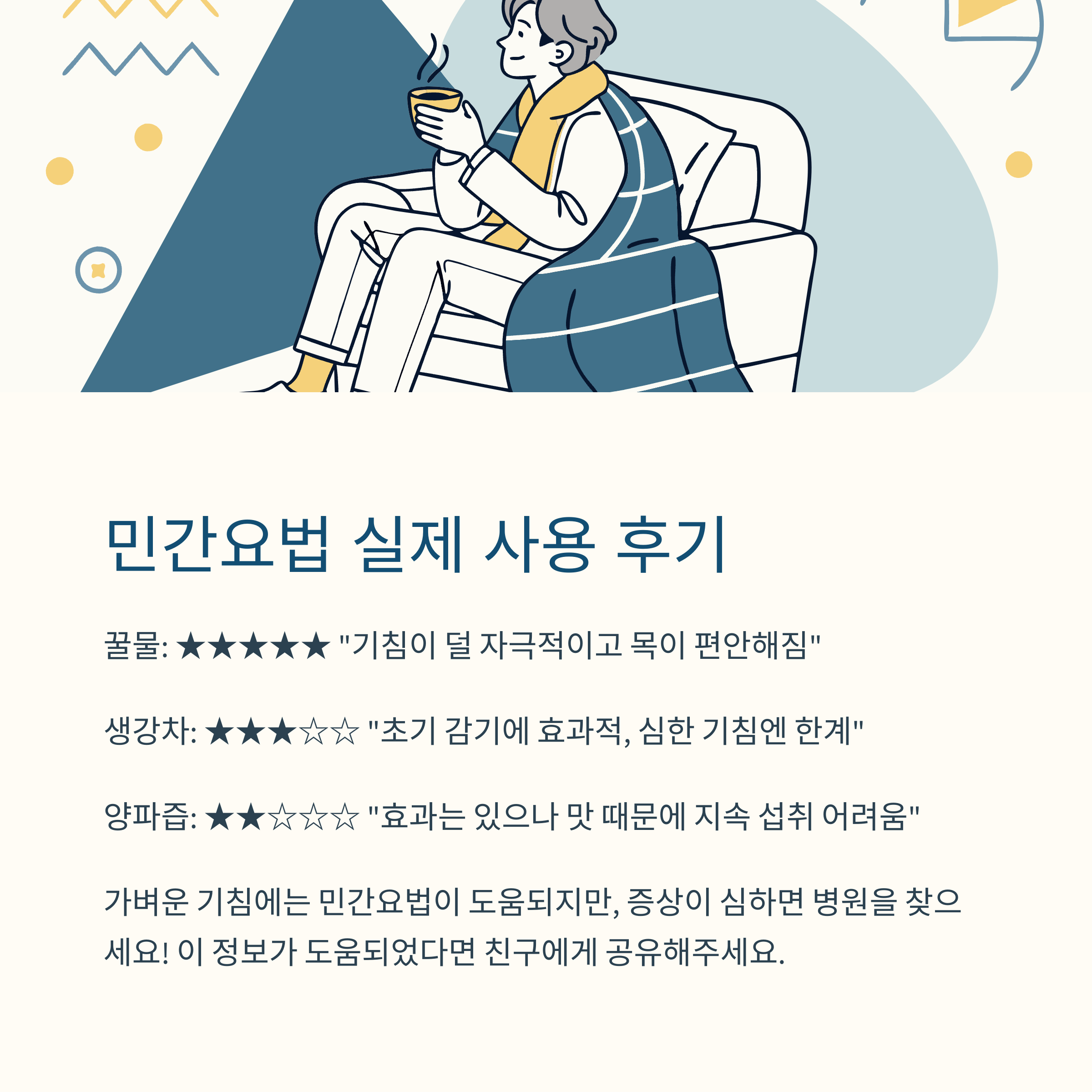 - 생강차: "초기 감기 기침에는 효과 있었으나, 심한 기침에는 한계" (★★★☆☆)