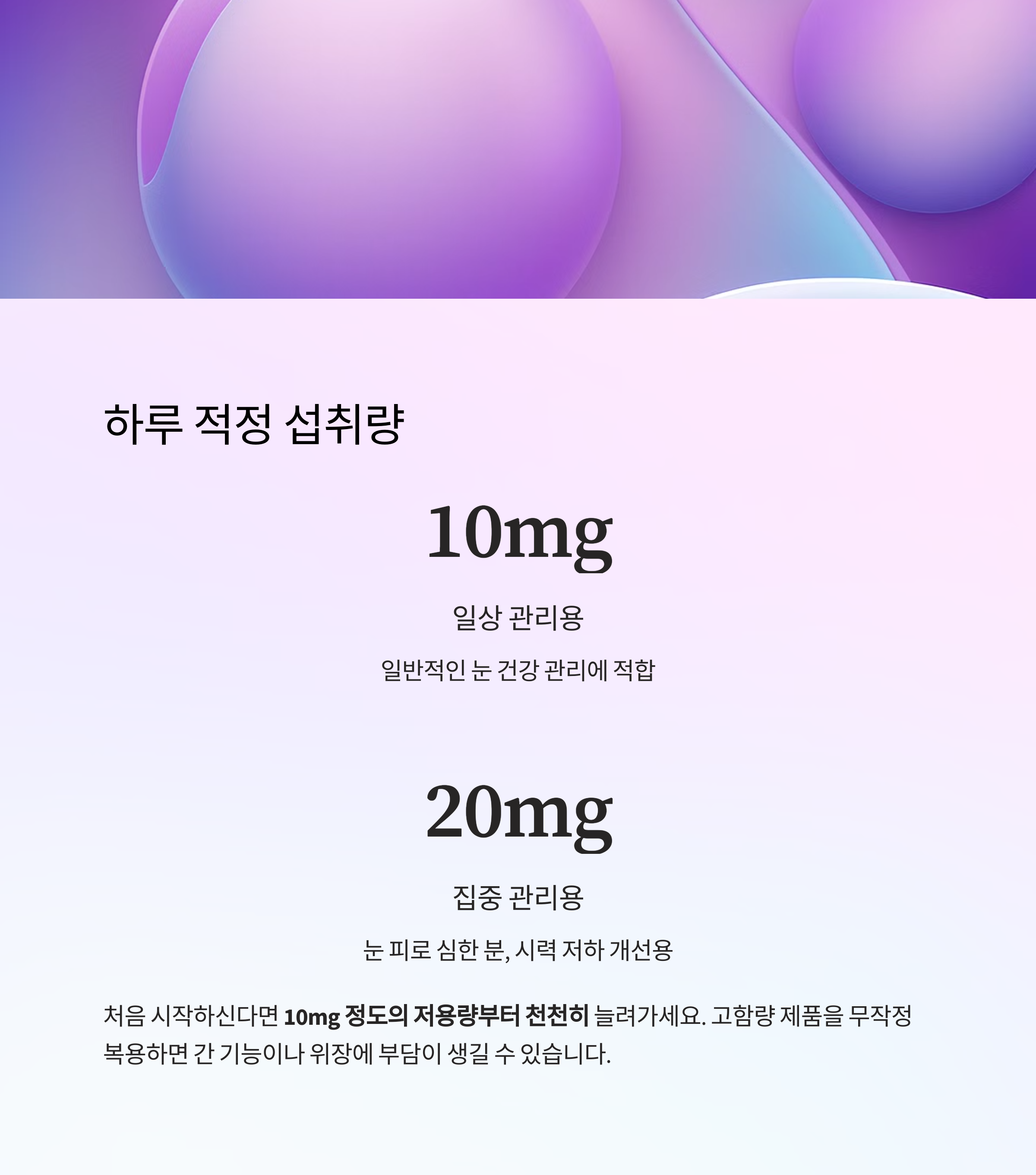 - 20mg 이상: 눈 피로 심한 분, 시력 저하 개선용