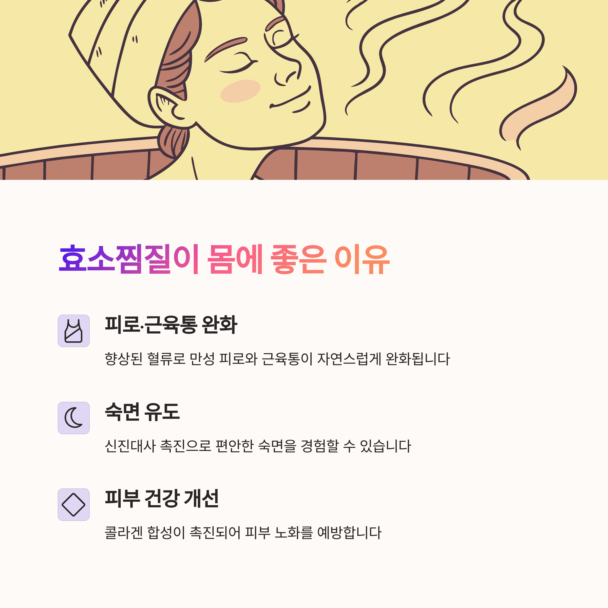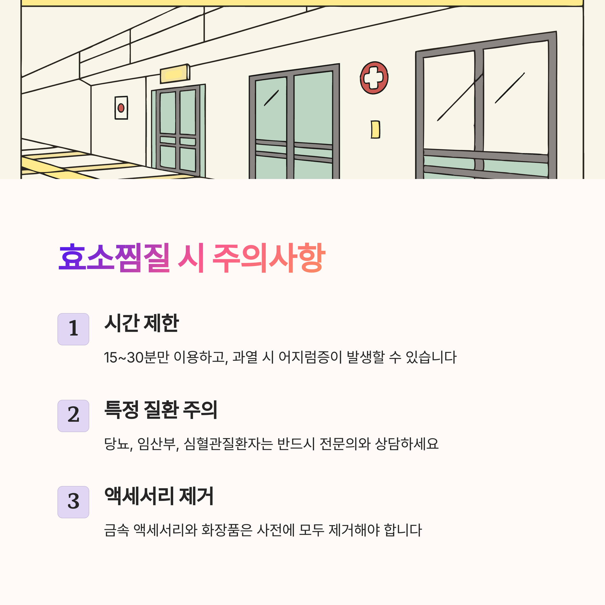 건강을 위한 찜질인 만큼, 무리하지 않는 선에서 천천히 즐기는 것이 중요합니다.