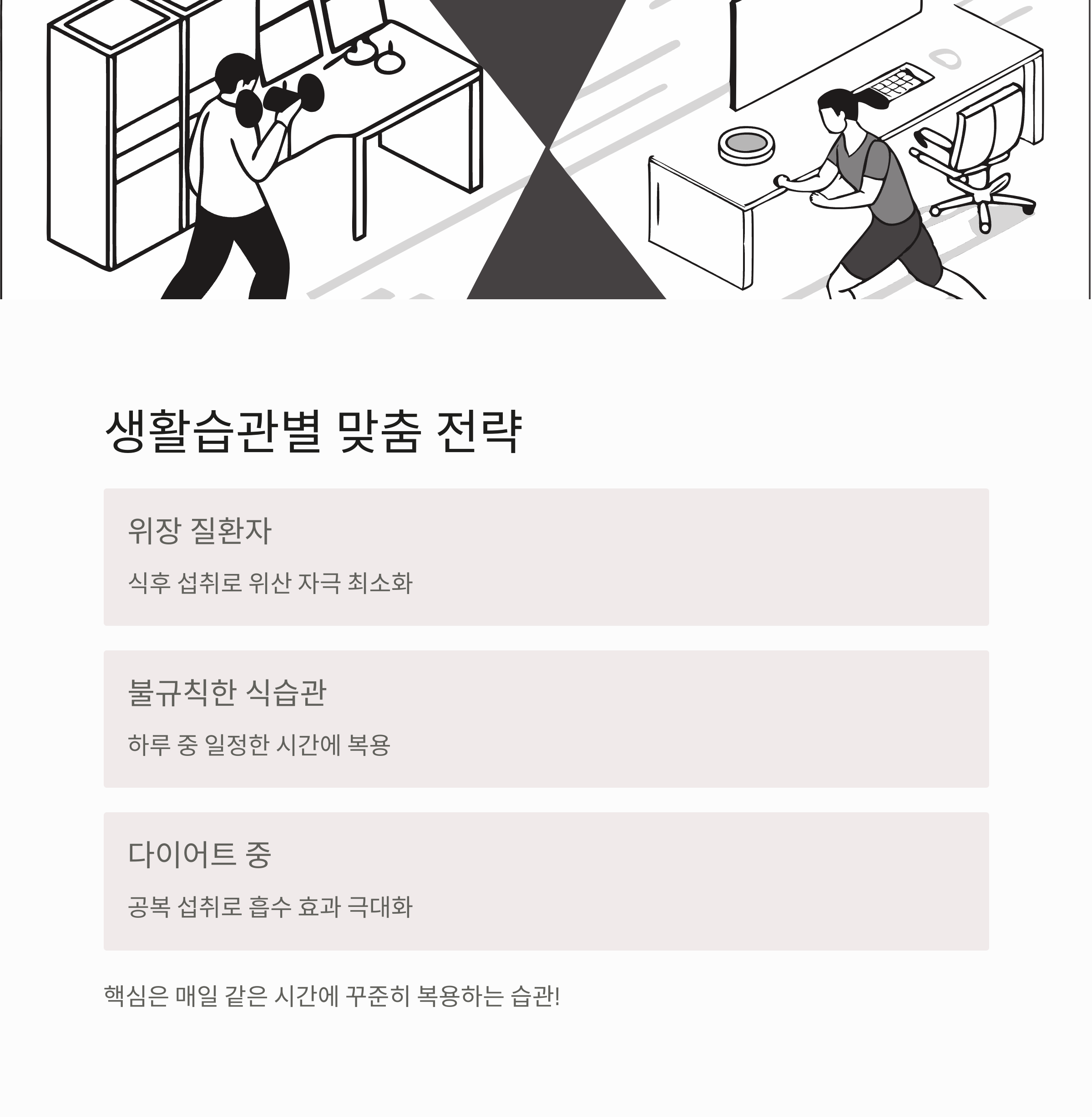 자신의 라이프스타일에 맞는 최적의 복용 시점을 찾는 데 도움을 드립니다.