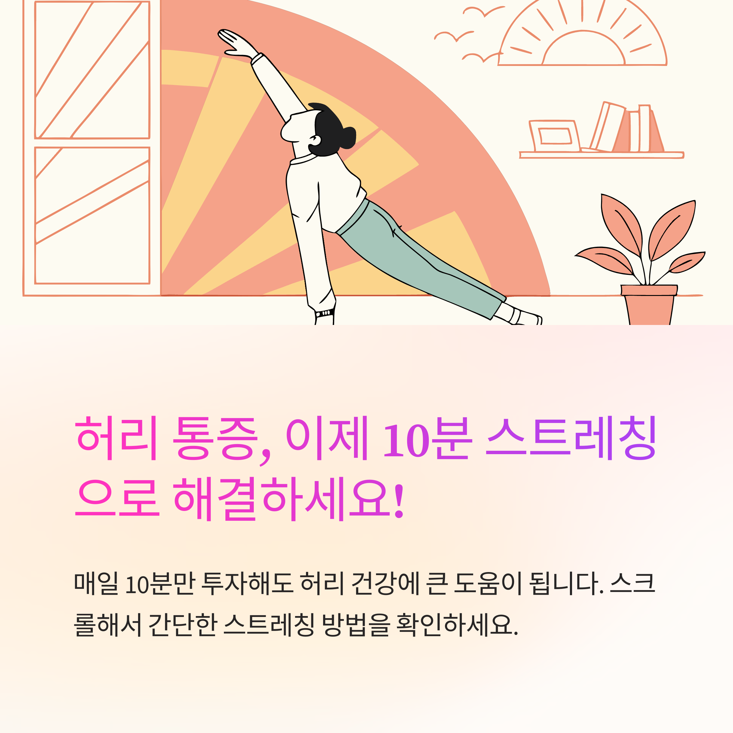 전문적인 기구나 공간이 필요 없으며, 매일 10분만 투자해도 허리 건강에 큰 도움이 됩니다.