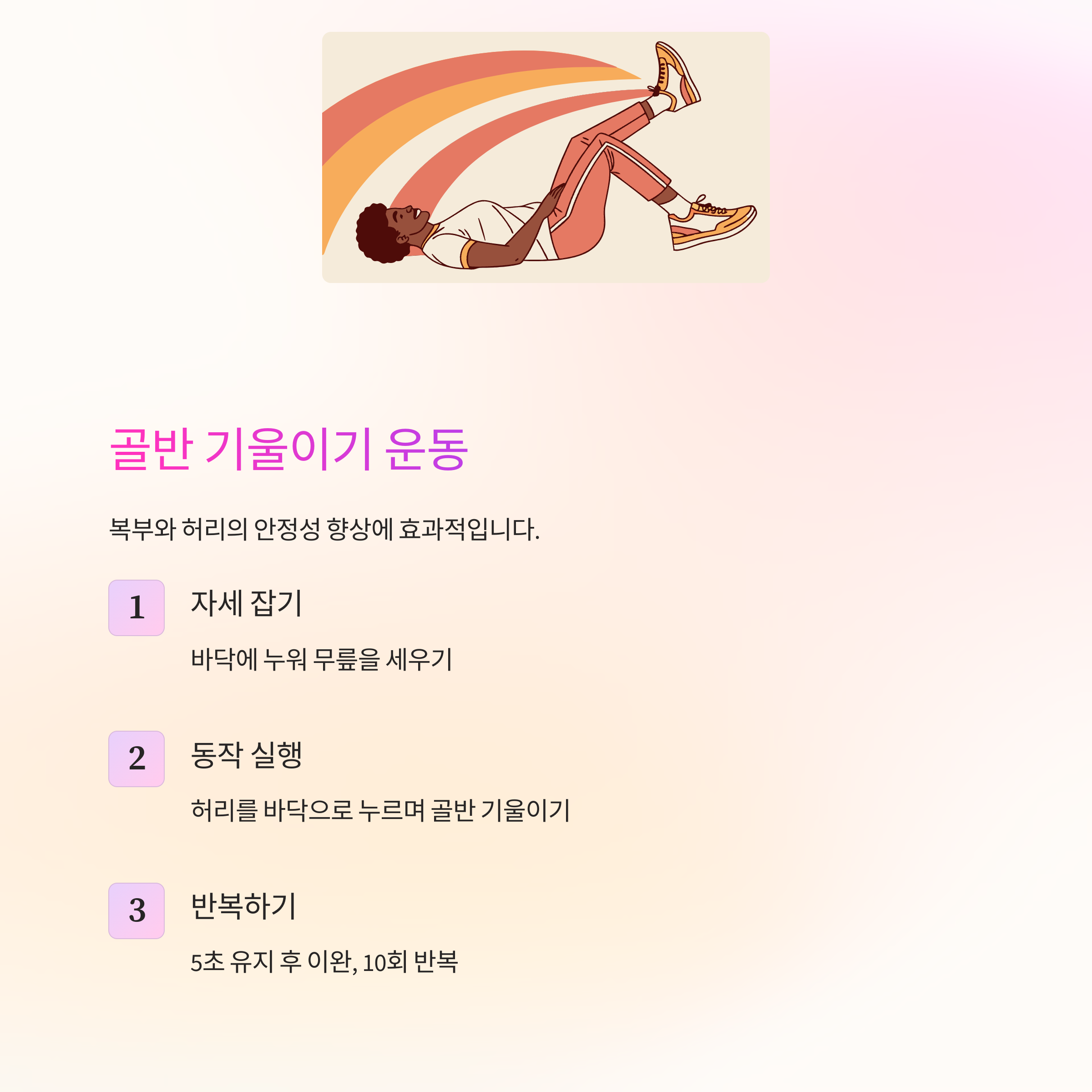 | 골반 기울이기 | 5초 유지 | 10회 반복 |