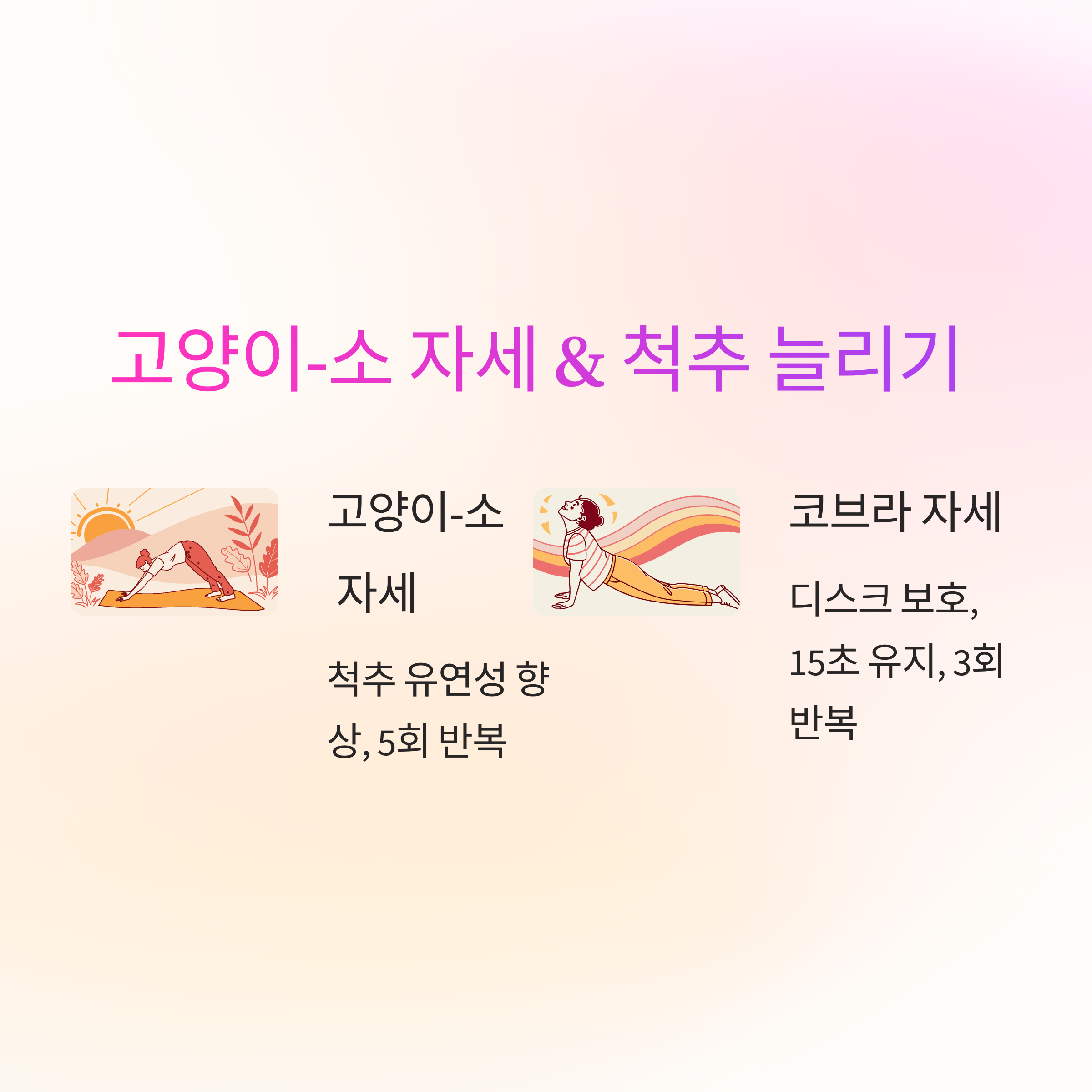 | 고양이-소 자세 | 5초/동작 | 5회 반복 |