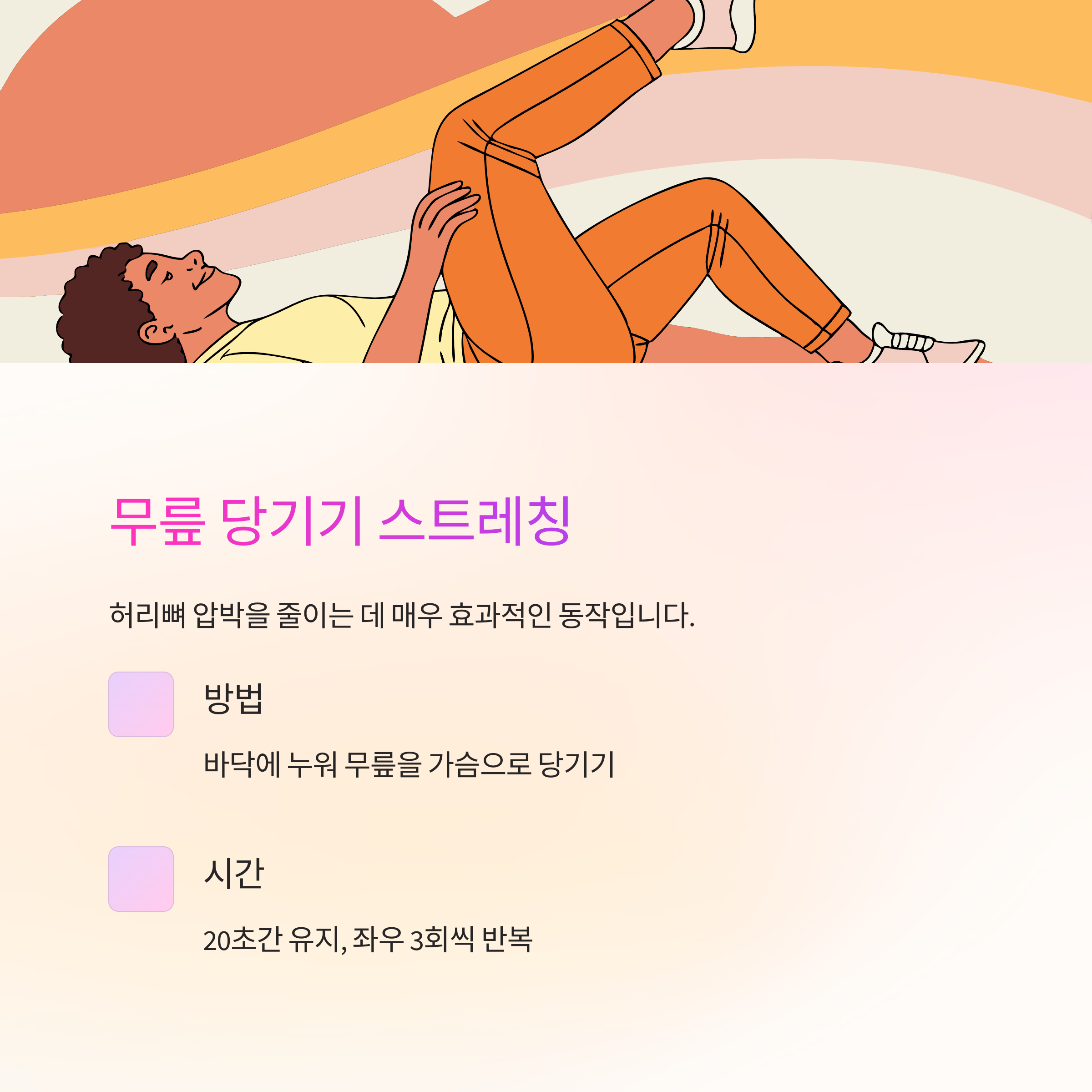 | 무릎 당기기 | 20초/회 | 좌우 각 3회 |
