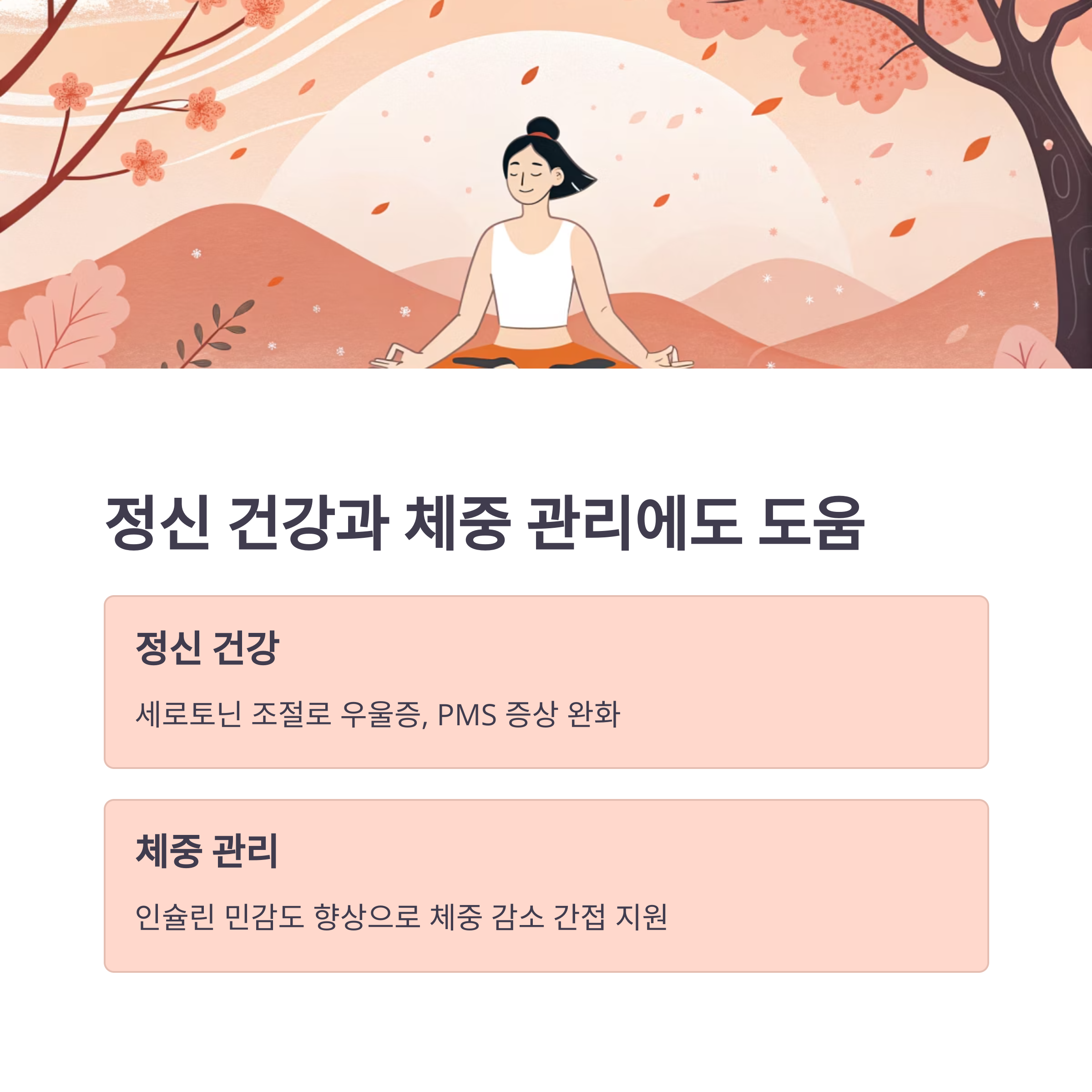 즉, 기분장애 개선에도 긍정적인 작용을 할 수 있으며, 산후 우울증 또는 월경 전 증후군(PMS) 같은 정신적 증상에도 활용 가능합니다.