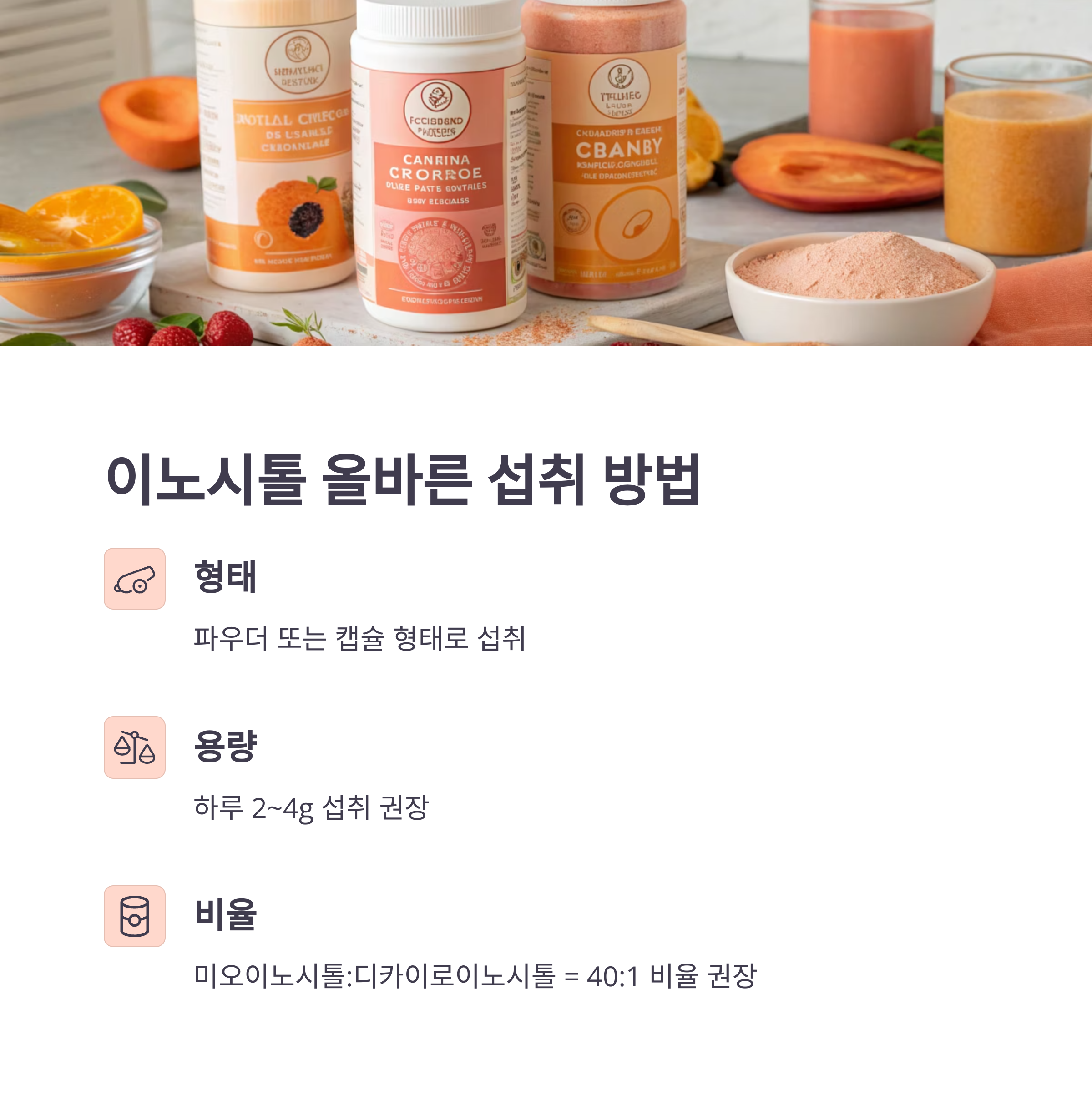일반적으로는 하루 2~4g 섭취가 권장되며, 개인에 따라 미오이노시톨과 디카이로이노시톨을 40:1 비율로 혼합된 제품이 효과적입니다.