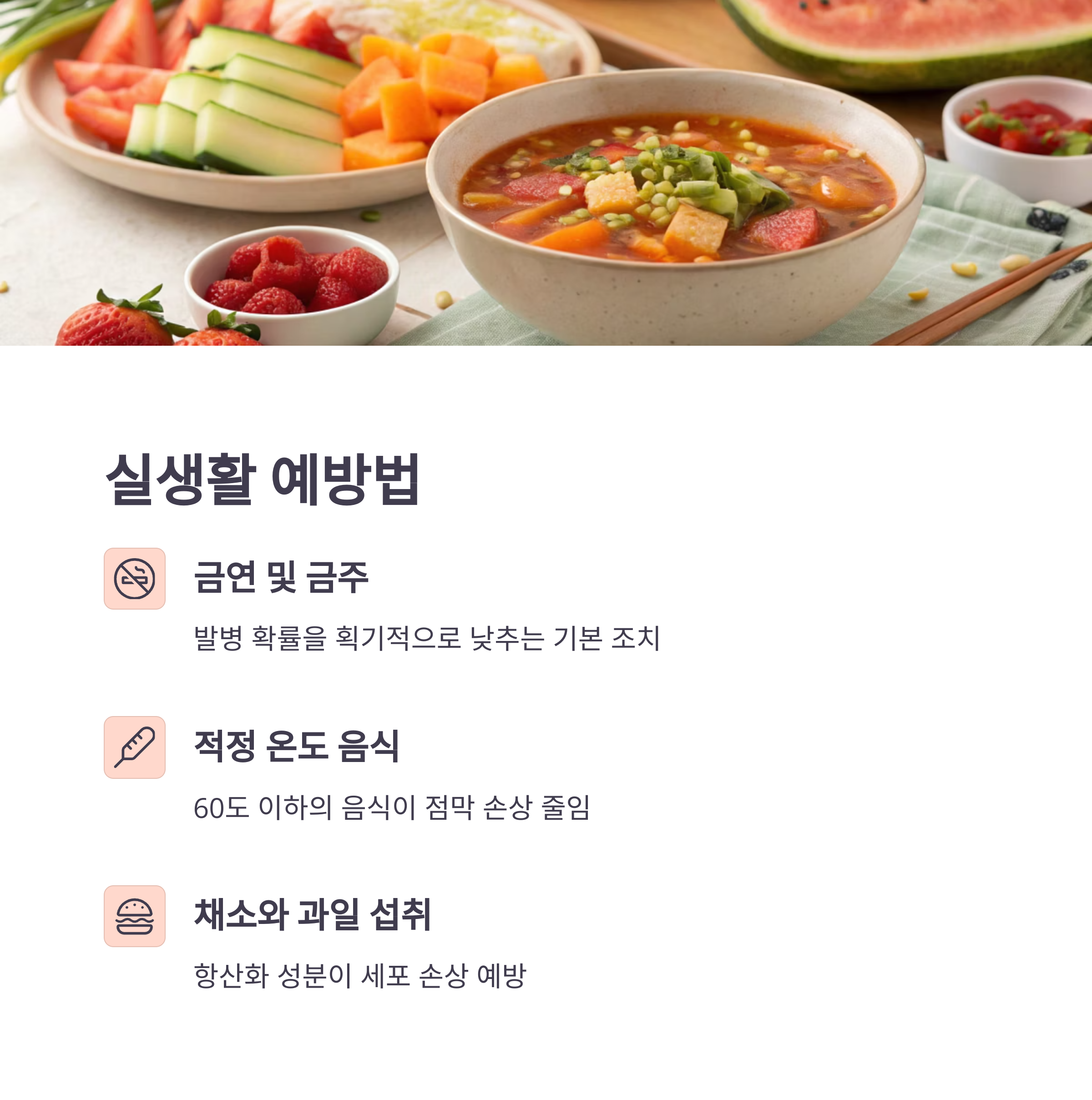 | 적정 온도의 음식 섭취 | 60도 이하의 음식이 점막 손상을 줄임 |