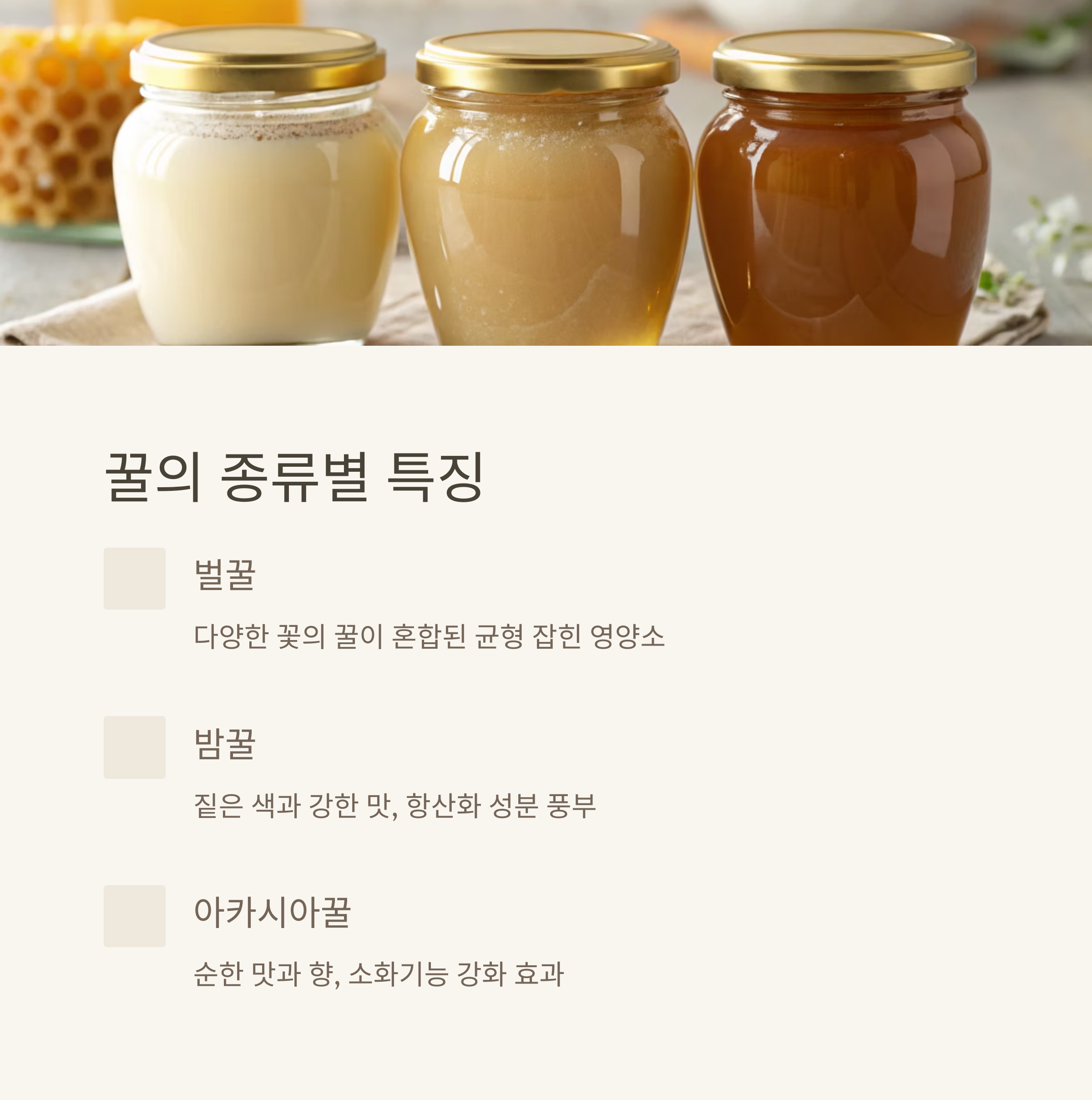 이 글에서는 세 가지 꿀의 성분과 효능 차이를 정리하고,
