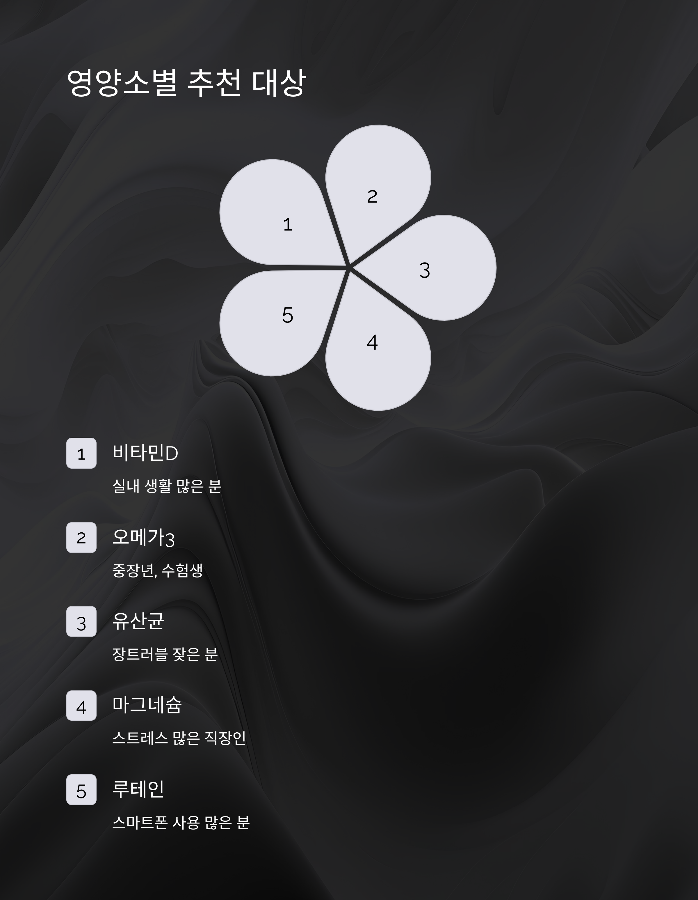 자신의 건강 상태와 필요한 영양소를 먼저 파악하는 것이 중요합니다.