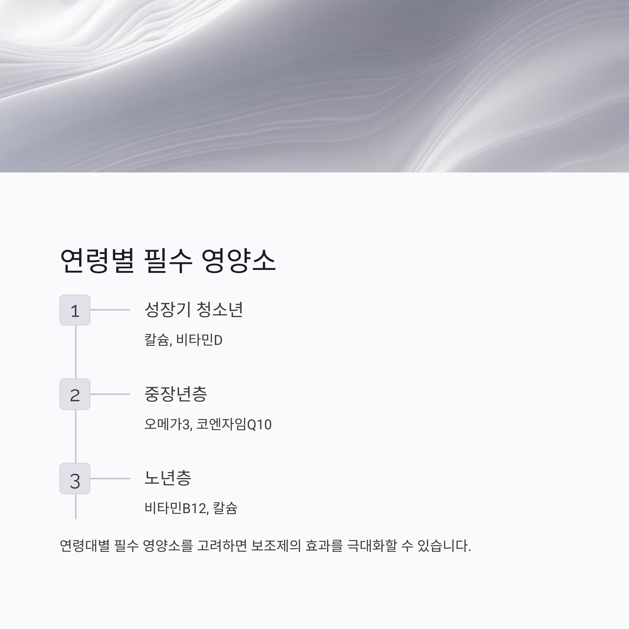 연령대별 필수 영양소를 고려하면 보조제의 효과를 극대화할 수 있습니다.