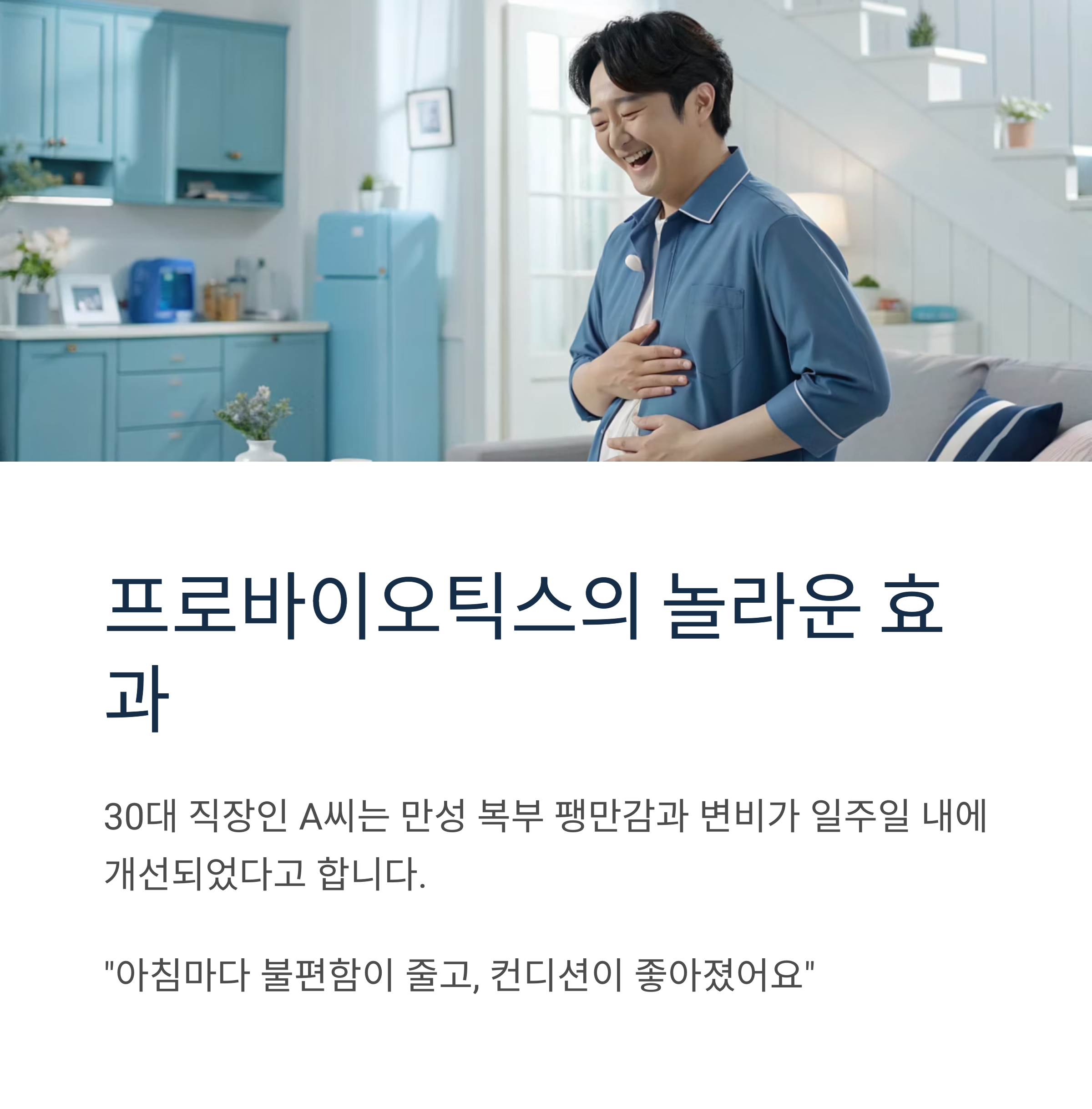 | 프로바이오틱스 | 장 건강 개선 | "변비 없어졌어요", "화장실 스트레스 줄었어요" |