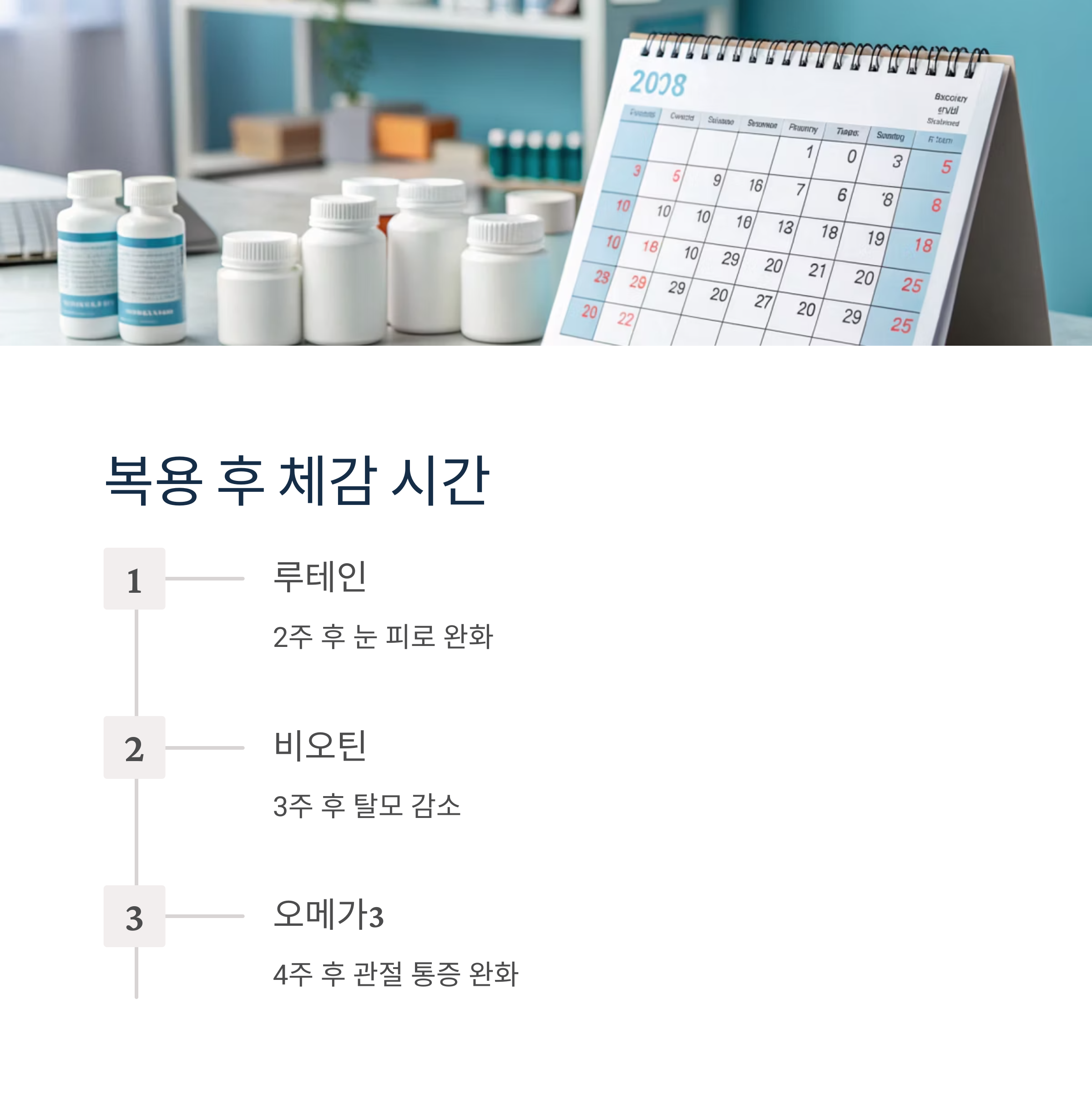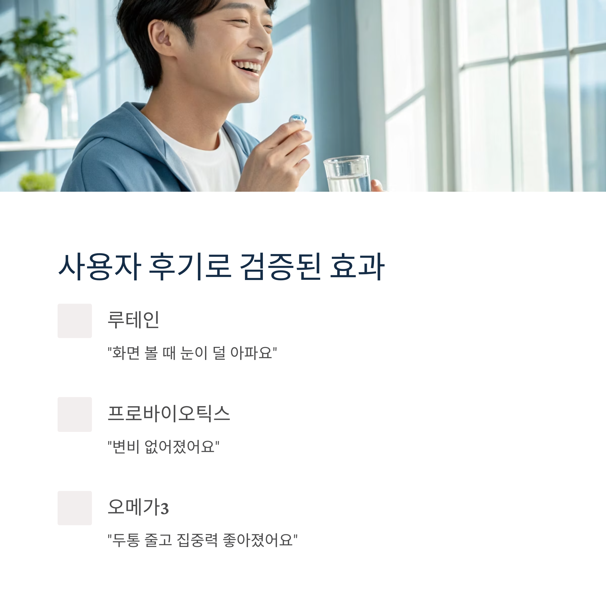 | 루테인 | 눈 피로 완화 | "화면 볼 때 눈이 덜 아파요", "안구건조에 좋아요" |